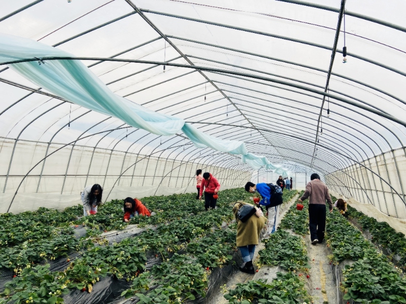 花艺培训结束后,大家又来到了草莓基地采摘草莓。草莓大棚内生机盎然、温暖如春,在一簇簇翠绿的植株间,随处可见鲜红娇嫩的草莓。大家手提篮子,在嫩绿的叶子中精心挑选一颗颗酸甜可口的草莓,并采摘进篮子里。欢声笑语在温暖的大棚里飘荡,大家尽情体验农家乐趣,享受“莓”好时光。